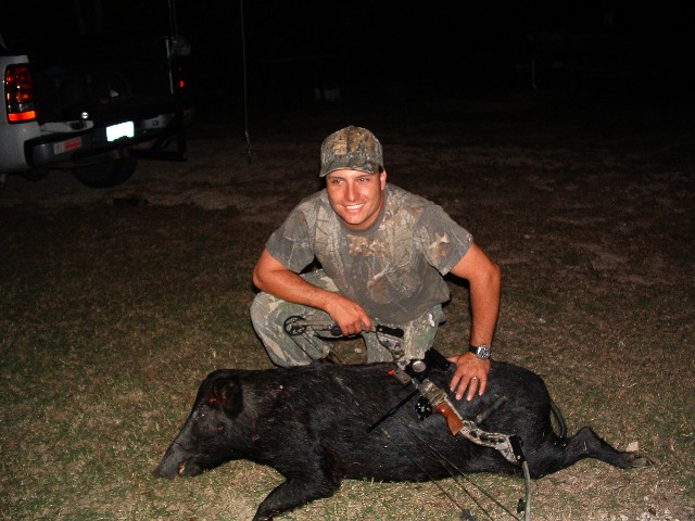 Well I have been on a mission for the last 4 years or so to stick a hog with my bow. I have a few P/Y whitetails on the wall and have shot pretty much every thing but a turkey or a hog with an arrow. It FINALLY Happened tonight. I shot this 150# sow at my lease. I have hunted 3 times this last week and the 2 other times I have seen this sow , a 100# boar and about 11 -45 to 50# pigs coming into my main feeder. I was winded the first trip. The second trip the feeder didn't go off so they stayed in the brush but tonight I scored.