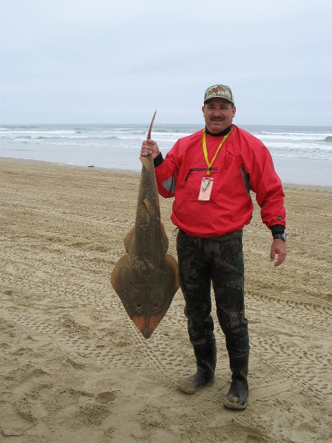 Went Surf Perch Fishing with my neighbor on Saturday. We live about 5 minutes from the beach and thought we'd give it a quick try for our 5 fish limits. We find a promising hole in the surf and first cast my buddy hooks a little Barred Surf Perch and releases it, second cast the same. We're thinking "this is good" but I'm blanked on my first two casts then on my third...thump!....hookset....ZZZzzzzzzzzzzzzzzzzzzzzz goes the reel. Whatever this thing is, it OWNS me!!! I'm on with 8# Maxima with a 10# Trilene leader and a little Diawa BG13 spinning reel! I was hoping it was a big 'ol Halibut but after 15 minutes of in and out, I finally get it up in skinny water where my buddy can see it and grab it by the tail and he does.