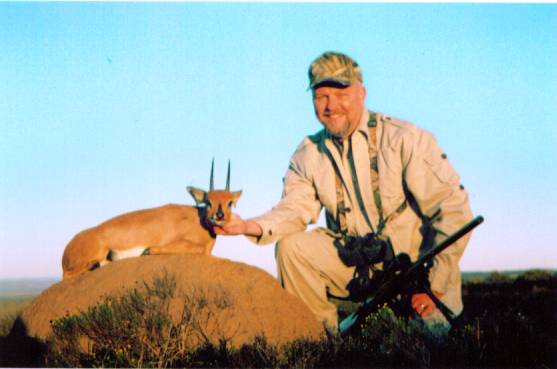 Day 3: July 15th. The evening before, we had spotted a nice Steenbok just at dusk. Meyrick advised me that he would most likely be with a female, and remain in the immediate area. On the morning of the 15th we returned to the area and I had just noticed the old stone fence where I had seen him the evening before when a female Steenbok jumped up out of the grass. Right after her was the same male I had seen previously. I exited the truck, pulled my .223 out of the case and bolted a round into the chamber. The Steenbok bounded uphill and stopped and a rock ledge, observing us down below. I adjusted my Bipod and centered just behind his shoulder. Range was 141 yards. I fired and zipped right over his back...he stood there. Lowering my crosshairs to the bottom of his chest, I squeezed the trigger and "Thump!" He crumpled. Again, the 60gr Nosler Partition went through this very small Antelope and did mimimal damage to the skin. I'm having him mounted lifesize; standing on a rock ledge for a wall mount. To be continued.....