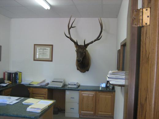Anyway, he looks over my shoulder everyday at work. I wasn't going to do a shoulder mount on it since I have one in my house and there isn't room for another, but there was a young hunter in camp who offered to cape it in camp and mount it for $500. He was new to taxidermy and wanted to do an elk. He did the tanning himself and I got it back in about 5 months, but the quality is not the best, I'd give it a C-.