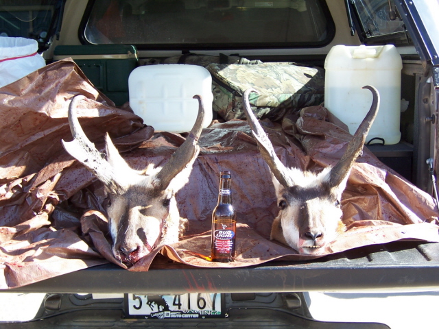 Here are the fruits of our labors. Had a lot of walking today as it was opening day and the place was crawling with out of state vehicles. Didn't see a single in state vehicle today with the exception of a warden. They ran the roads and we walked into a watering hole and hunkered down while antelope ran around us all day. Shot both of these at just over 300 yards. One with a .243 and an 85 grain Barnes XLC and the other with a .270 and a 130 grain CT Ballistic Silver Tip. Both dropped with one shot to the boiler room, but the BST did much more damage to the meat. The Barnes went int and out taking out the heart and leaving a an exit hole no bigger than 1".