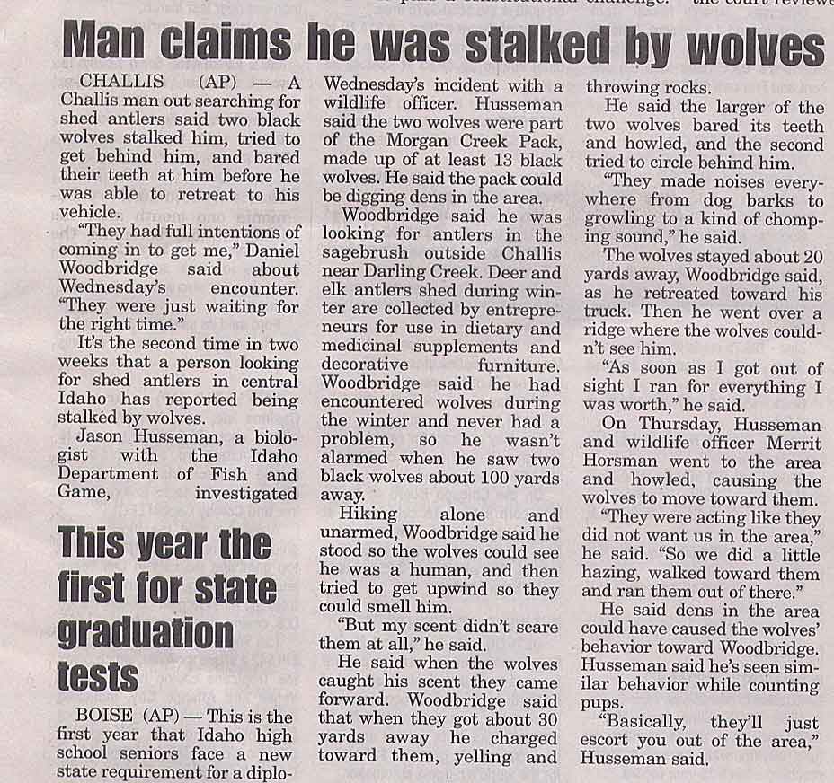 Wolves do follow people all of the time. But, I bet your wildlife boys aren't telling anyone about the fellow that was killed by wolves this last year in northern Saskatchewan. They believe it is the first 'recorded' case of a human being killed by wolves in North America. Of course, by the nature of the beast there would be little left for evidence after someone was killed and eaten by a pack. It is not surprising that many people believe this is hardly the first time it has happened, just the first time it was documented in recent times.