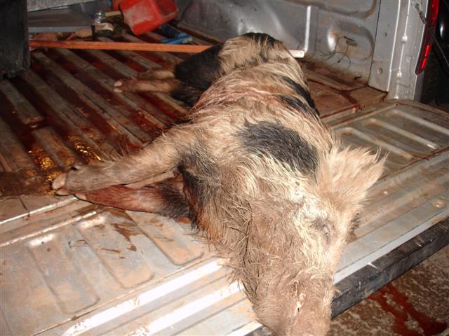 SW Oklahoma is over run with wild hogs. i hunt them at least one day per week every month of the year, usually with a .50 muzzleloader. Here are two that were killed recently. The sow went about 140 pounds on the hoof. The spotted boar went about 175 pounds. The sow was running full tilt at about 90 yards when hit . She was DRT. The boar was standing broadside at about 120 yards. He was hit behind the shoulder. At the shot the boar took off, ran about 75 yards and hit the dirt. The bullet shredded the heart, lungs and diaphram. The exit hole was about 3/4".