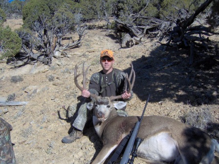 Here's a picture of my opening day buck in SW Wyoming. Saw this one the night before and left him alone in hopes that he would be there the next day. Hiked in and got in a position the next morning so we could glass the hill we saw him on. Grunted a small bucks within 30 yards early and had fun with them. Didn't know a mulie would respond to a grunt like that. Didn't see anything so I decided to climb the canyon wall and push the timber back down toward the other two guys I was hunting with. Got about two thirds of the way up, started shedding some clothes and saw him skirting the hill at the top of the canyon. Hit the grunt and he stopped instantly looking down to see where it came from. Ranged him twice at 353 and decided he was good enough to take the shot. One shot through the lungs put him down. Used a Remington 700 Classic in .300 Savage with a 130gr. Barnes XLC. It was about the extent of my range, but he was in a hurry and there wasn't much opportunity to get closer without losing him in the cedar trees. All worked out pretty well.