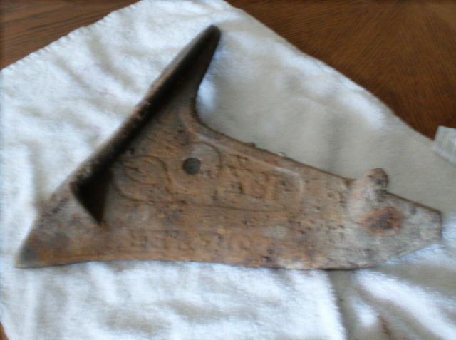Coolest thing, that plow point. It was over a foot down and under a root. (It's all old hardwoods these days.) They must've broke the bolt and lost it and it kept gittn turned deeper and deeper in the soil. I have nary a clue as to it's age but judgin by the writin, I would say early 1900's or before. There's a name or somethin at the bottom that I just caint make out yet..but it looks to be HC then an A and a few more..one looks lke a P.