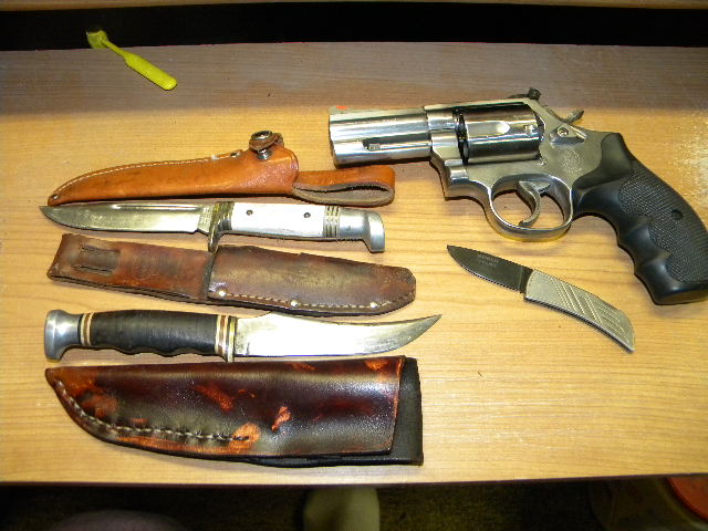 The knives in the picture are the ones I talked about in the last post. The S&W is the 44 Spec I picked up at the ausction on Saturday. Gun has been shot ..but not very much It is a model 696 and has the firing pin on the hammer..not like the newer guns. The small knife in the picture is a ceramic bladed Boker. Spensive little buggers but got it at a yard sale a year or two back. 3 bucks. They say they never need sharpening..but it ain't so. I was advised they need to be sent back to the maker to get sharpened.. Doubt if is it is worth doing.