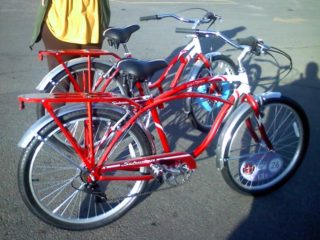 Some of you may have known me long enough to know that I managed to strip 60+lbs off in 2008-2009, but I still have a long ways to go to be "healthy" As another step towards good health (notice I say good health, not losing weight. My goal is good health, period.) we purchased a matching set of bikes yesterday. Just ignore the dust on the bikes, they have been sitting on the racks for sale for several years. They are a pair of Schwinn Point Beach Cruisers. Seven speeds (shimano gears). A woman's, and a man's matching set. Brand new set that look even better with the dust wiped off.