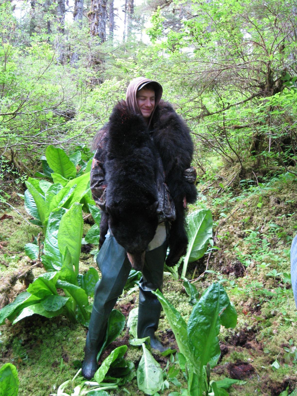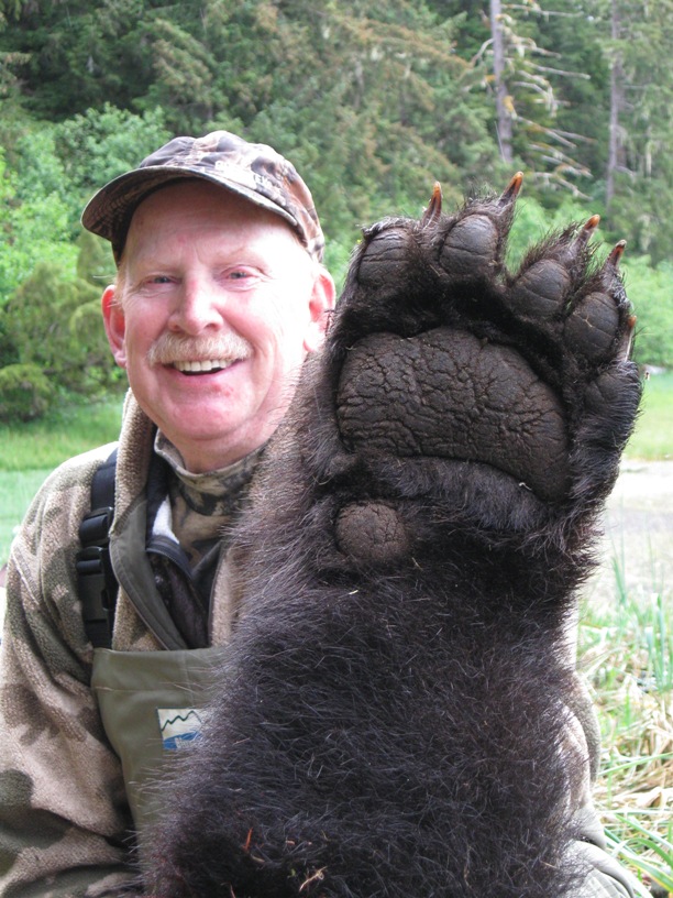 On the first night, John and I were guided by Alex, Spark went alone with Dale. About 2 hours into the hunt, we spotted what looked like a good bear about 2 miles down the shore line. We hopped into the boat to close the distance but before we could gain ground on it, it disappeared into the rain forest. After that, we motored out around another inlet and spotted another bear, again from about 2 miles. We closed to within about 3/4 mile and beached the boat. We glassed the bear for about 10 minutes and determined it looked good enough to get closer. In order to get the wind right we had to run around the bottom end of a bay and close in from the south on the same shore that he was feeding on. With the tide out, it was quiet but trying to run in the mud with hip boots on was quite the chore. Soon we were within about 300 yards of where we thought the bear should be but we couldn't find it. We went from the high of the excitement from the stalk to the low everyone feels when you think you blew it. We were standing there discussing what to do next when he popped back out onto the beach and was feeding toward us. We were on the wide open beach with nothing to do but lay down and take a rest of off Alex's pack. The bear was a little over 300 yards but was working toward us....slowly. We layed in the mud and waited. And waited. For about 1/2 and hour for the bear to finally close to within 200 yards. Alex did not want us to shoot further than that. When the bear reached 209 we said close enough and John sqeezed the trigger. The bear ran to the woods and came a little closer at which time John shot again and the bear disappeared. At this point, darkness was coming and we couldn't find any blood as we had expected. John felt that both of the shots were good but we decided we would wait until morning to follow up. The next morning found all 5 of us back at the scene and it wasn't long before Dale found blood....lots of it. We followed it for about 50 yards to where the bear had bedded. Unfortunately, there was no bear. We started through the brush trying to find out where it went when Dale found more blood, but the freshness showed that we were in the thick stuff with a very much alive bear. After about 30 yards Dale and John came upon the bear at mere feet and when it got up to leave John put a final finishing shot into it from behind. We were all a little perplexed as to why the bear was still alive but upon skinning we found that John's first bullet was slightly high and did not take out the lungs, his second shot went through the shoulder but was too far forward and again did not hit anything vital. The bear had lost a lot of blood but the final shot was the one that did it. Needless to say, we had lots of excitement and John got to shoot for 2 days! John got the pleasure of carrying out 6'+ of bear hide.