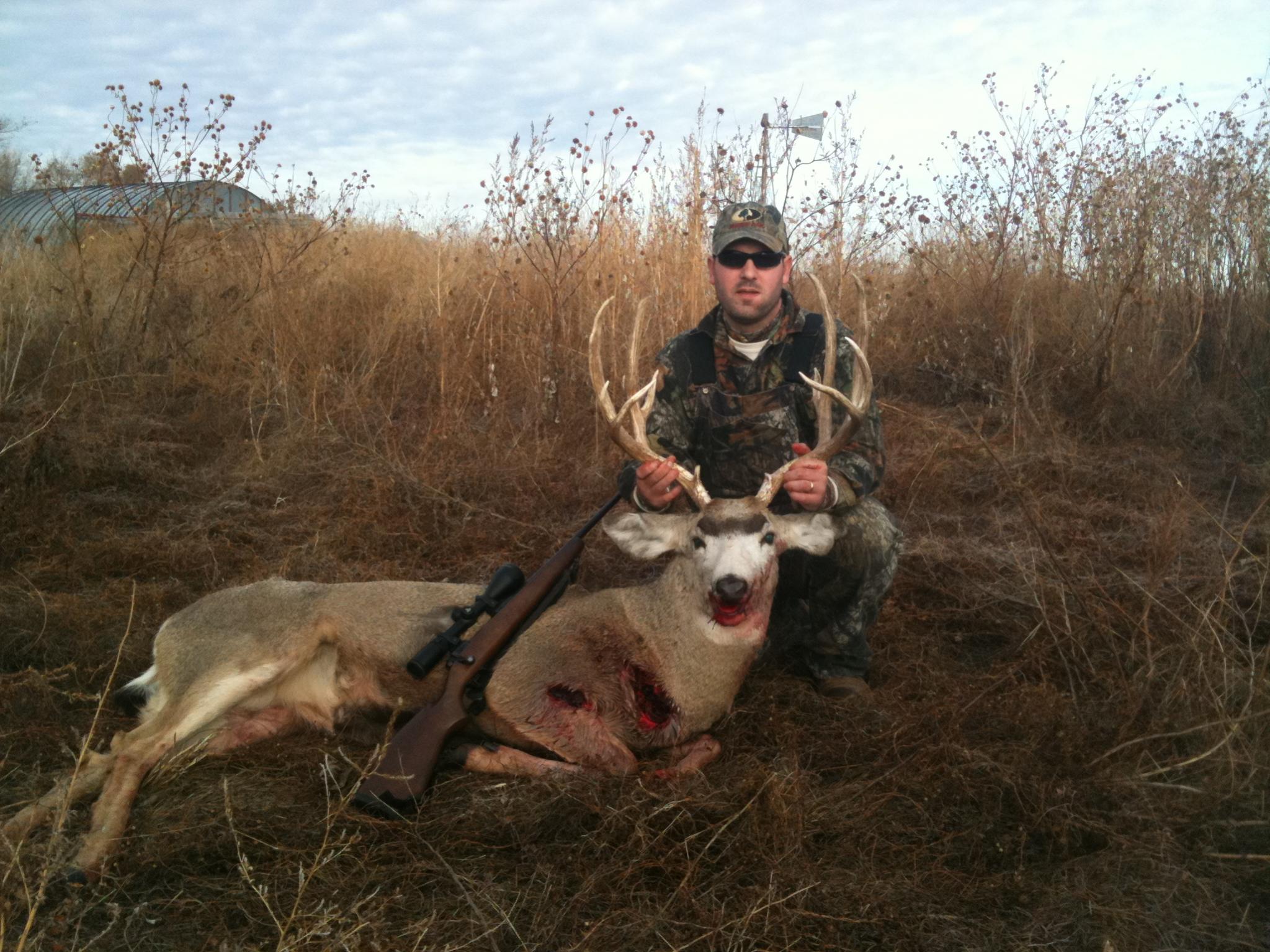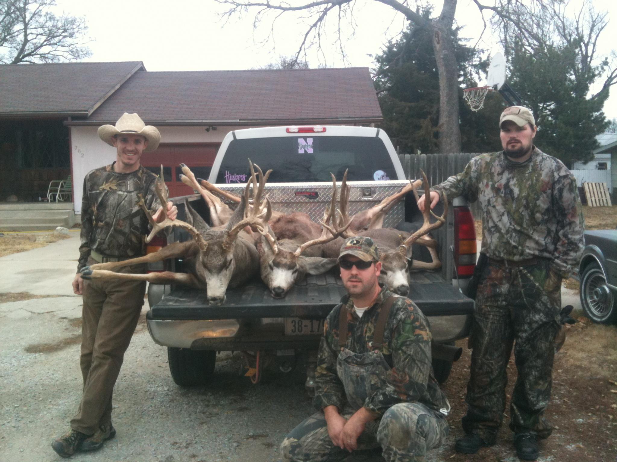 Wow, what a year it was and what a good time. Over the past 12 years that I have been in the service, me and a good friend of mine have always talked about going back to Nebraska to my home and shooting a big Mule deer for him to put on the wall. 911 happens and the deployments start, and they have yet to stop. We both have PCS'd to different locations. Unfortunately, he gets discharged and medically retired out of the military for numerous back problems. Serveral surgeries and years later, we finally get to do it. I recently moved to Minot ND ( because the Air Force told me I had to ) and am less than half the distance home to Nebraska than I was before. I finally get to hook up with him and another friend of mine who served with me while I was in Florida. We all met up in my hometown and had the best time of our life. I was able to put everyone in the hunting camp on a big deer this year and myself as well. Kyle and Chris are doing full head mounts and I am doing a european mount on mine. There were lots of big deer killed at home this year. I can't wait till next year. Here are the pictures of our deer and some others from home that were killed as well.