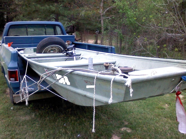 Here's a picture of the boat (so far nicknamed purty ugly) sitting in the back of old blue. Yes it is sticking about 6 feet off of the tailgate. Yes that's how it will be hauled to the river each time. Now I still gotta find me a 5-10hp outboard for it.