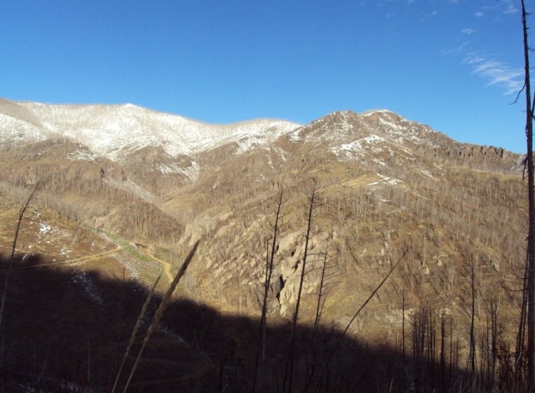 Now here I go, a guy that’s got 10,000 acres to himself, seeing over 1000 deer a day, some elk and I’m going to head to public land where no one would be stupid enough to go. I assure you, it was the snow capped peaks that were calling me. Thar’s snow and elk in those hills and I’m going after them, on my own. Because Bill had this lease, it was the only place he could outfit or guide, so having the tag I had and the freedom, I chose to just break up the day and put on some miles. That 3rd day I started the hike up a draw of snow with many drainages. The terrain was a nasty vertical, burn that I knew I would find elk, the deeper I went in. Snow was only 4-6” deep at this point. About 2 hrs into my hike I spotted an elk in the farthest hole of this mountain, so obviously I need to go investigate and see if there are more. An hour later I’m able to spot into the hole a little better and I run into a nice bunch of tracks about 20 head of elk in the snow. Of course they go up, so I go up and up. I would hit drifts of snow and go into my rear-deep of it. Meanwhile, still heading up and out of the burn and into a nice open park. The tracks led into heavy timber and I’m thinking this is the spot I want to stay until dark, to catch these elk coming out to grab a bite. Now to this point, I figured I put on about 8-9 miles on foot in snow ranging from 4” to 3 feet. It wasn’t the easiest of travelling to say the least.