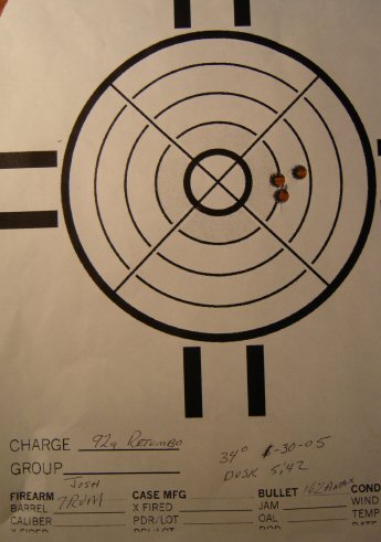 I shot my first group right at 1/2" with 162 grain A-Max and 92 grains of Retumbo. Not too shabby for the first one. I'll be working up some other loads and breaking in the barrel this weekend. Have to say I'm pretty impressed with the Rem 700 xSS's. That 300 RUM was the same way. Only took 3 loads to get 3 bullets touching.