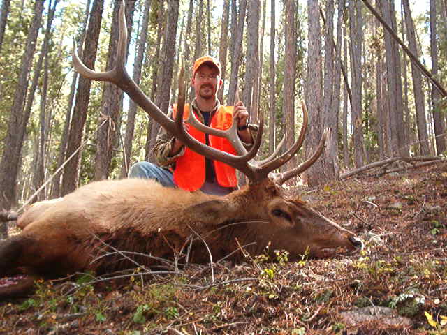 2 Days before the hunt: We arrive only to find a nice bull and over 30 cows not more than 300 yards from the lodge. He was putting on quite a display and it was a GREAT welcome! Talk about chomping at the bit for season Day before the hunt: We went to the Dillon Rifle Range to shoot the guns, enjoy the scenery and get some good filler footage for the TV show. 1st day, 10/9: Ol_spark, Leo (ranch hand) and I were heading to the “knob” to try our hand at a long range elk. As soon as we got out of the truck 2 bulls were bugling not more than a couple hundred yards away. At a couple points in time we could hear the herd walking, but it was still too dark to shoot. They moved their herd up higher and we never caught up with them. As we got to the knob, we set up the camera and guns getting ready for some action. We heard another bull later on that morning and DJ (co-owner) and his daughter had a cow run up to them but they never got a shot at it. It was to be her first elk. We met back at the truck around 10:30, with no elk but a very exciting morning to say the least. At 4:30 we left for the “high-parks”. Ol_spark set up in the one park, I hid in the heavy timber over looking another park and Dave (co-owner) went to the higher park. No elk tonight but as we walked out we ran into a nice herd bull with about 20 or so cows in the dark just bugling his head off. We got pretty close until they smelled us and took off towards the “Bowl”. It sounded like 20 bulldozers crashing through the woods as they took off. As they reached the Bowl another 600 yards off that bull gave us one final farewell bugle. I thought, “I’ve got your number tomorrow!” 2nd day, 10/10: Ol_spark and I head to the “knob”, but I split up with him wanting to go after that bull we busted the night before. I got about 300 yards from him and the bull bugled in the same spot we had left him the night before. I took off after him. I could hear the cows mewing and he’d bugle every 2 or 3 minutes. It appeared as if he was moving his harem up again so I tried to get higher and then move in on him. I used a Primos Pack bugle and started bugling like a young bull, only to keep track of where he was at all times since I knew he had about 20 or so cows with him. Every time I’d bugle, he’d bugle back, and I’d move in closer on him. My first encounter was on a sharp point on the mountain. I had him with in 100 yards and he’d chuckle, but I couldn’t see him since I was in the dark timber. He was really running around trying to push his cows away from me. The next time he bugled he would be like 400 yards away, so I’d pick up and take off after him. The wind was in my favor so I pushed on. At times I was on my hands and knees crawling and we played cat and mouse back and forth about 4-5 times, bringing him into 100 yards or closer. Finally he had pushed his herd onto a steep ridge that seemed to open up a bit. I bugled, he’d bugle back, then I could see flashes of his cows every once in a while. Even though I had a cow tag I was committed to calling this bull in and killing him. The terrain was steep, but it looked open enough to make my move. Up until this point I was acting like a young bull trying to move in on him, so I figured I’d try to fool him into thinking I was stealing some of his cows. I used my Scery cow call that I just bought at Cabelas on the way out (That was the best $15 I had ever spent by the way). I cow called twice and the bull bugled, I answered right back with a bugle then cow called again…… That’s all it took. The next time he bugled he was 60 yards and coming. I could just see his big head swaying in and out of the trees in order to get through the heavy timber. He was coming... and fast. I was sitting down with my feet below me to hold me up from the steep angle of the hill and he was coming from my left. I raised the 300 Ultra Mag waiting for my shot. He came to about 40 yards and stopped with his head and full neck showing, with his shoulder behind a tree. With the crosshairs at the base of his neck where it meets his body, I figured this was my shot so I squeezed the trigger. Being in such an awkward position, the recoil of the gun pushed my Butler Creek scope cover into my nose splitting it open. This has never happened to me before, but I’ve seen it happen to others. As I walked up to this massive animal, the sting in my nose didn’t matter and I took a knee to thank the Lord for what he had given me this morning. I was close to tears as I sat there to admire this beautiful animal and the dual we had that morning was probably one of the most exciting days of my life, next to the day I was married and the day my son was born. After the shot the rest of the herd scattered, but that didn’t matter to me. I guess I did have his number this morning and now the work began. The bull came out on our backs because of the extreme steepness of the hill we couldn’t get horses to him. The pictures don’t do it justice. Cleve the guide and Ol_spark were there to enjoy the labor that lay ahead. We filmed the interviews and packed the bull out just in time for that evening’s hunt…..now for the cow tag