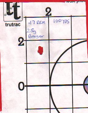 Real nice group. I can tell you that the 30 will group differently than the 25`s with the same load. When I start working up a load for a new rifle I set the powder drop on my Dillon 550 and load 5 rounds each of several different bullets. I then up the powder drop a 1/2 grn. or so and load the same bullets. It`s really very interesting to see how different bullets react as the powder charge goes up. I`ve run loads with 2 different .17 cal. guns in this maner comparing the 25 and 30 grn. Bergers to Calhoon bullets of different bullet weights. Some bullets seem to work better at one velosity while other seem to work well over a wide range of velosities. I`ll see if I`ve got any 30 bergers around here, got a kid asleep between me and my vault right now, so I`ll have to look later. I`ve gotten good groups with both the 25 and 30 grn. Bergers, and how did the Calhoon bullets compair the the 25 grn. Berger groups you posted???????