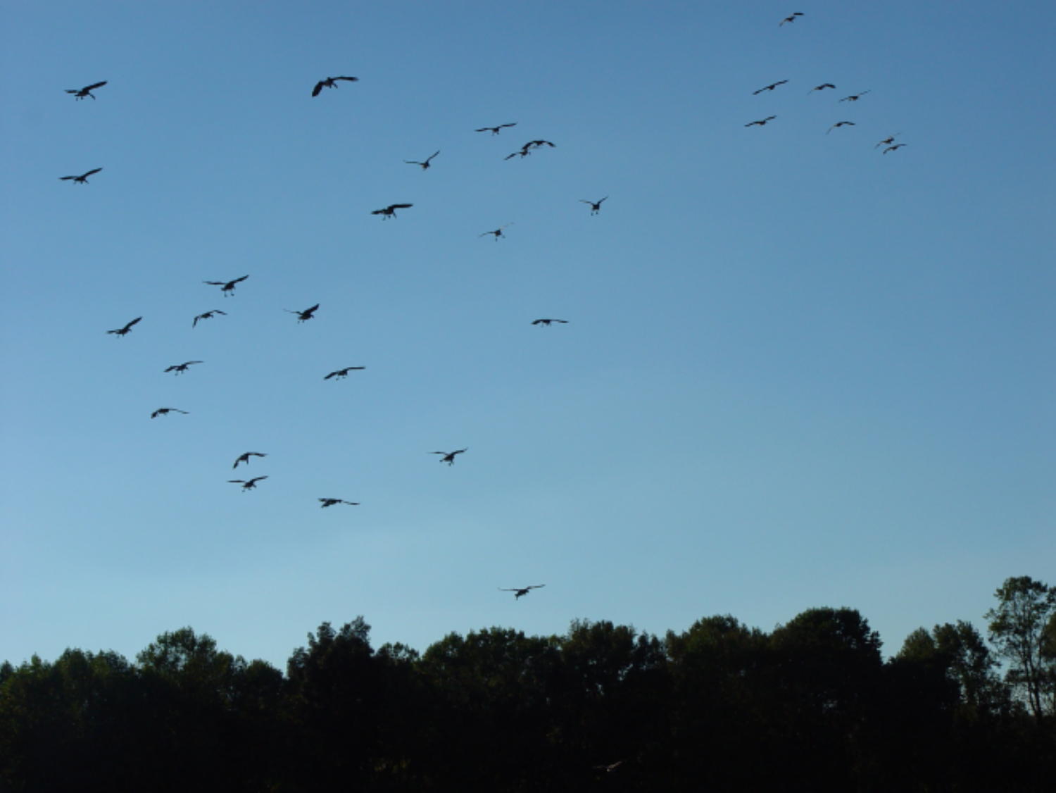 Well the geese are sure pouring into this area in the last two days Going to try to attach a picture of some migrators coming into the pond here on the farm. They came from up there where they were just Little dots in about 6 large circles. There were approx 60-65 in this group Of course they aren't all pictured in this one photo but it is really neat watching them come in like this