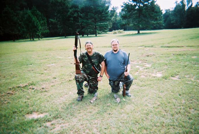 This is me N my huntin' buddy Darren right after his first squirrel. Normally I don't come to the house fer pictures after one squirrel each, but he couldn't have hit the broadside of a barn with a rotten apple after killin' his first one. I am the one with the single shot H&R there. Yup that's three hundred plus pounds of redneck there folks! (Also we are kneeling in my back yard)