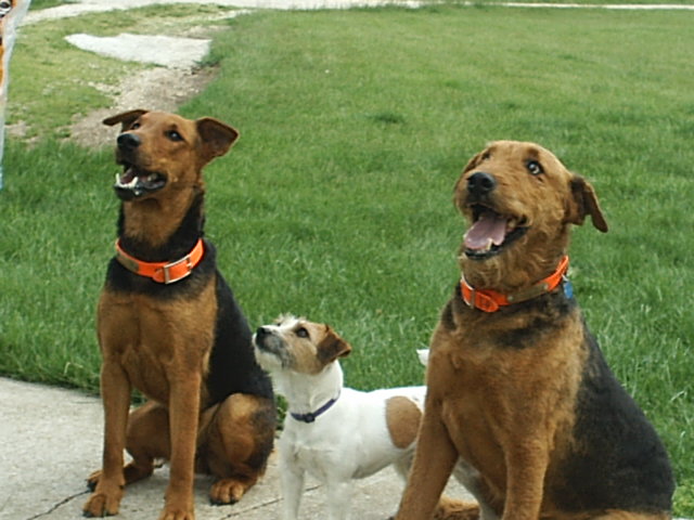 These are my Airedales and JRT. They are equal opportunity hunters, will sniff out, chase, catch and kill or bay or tree anything you want to hunt with them. Ive hunted coyotes, coons, squirrels, rabbits and birds with them. Tagger has also been a trapline dog in AZ before I got him and has hunted coyotes, badgers, bears and lions. Great dogs. Good pets. I love em.