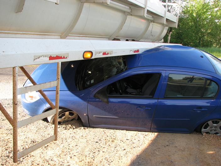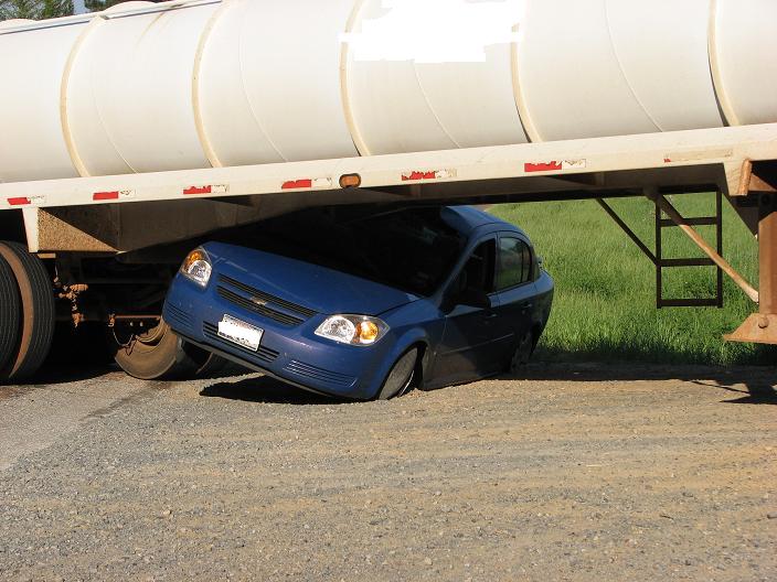 at approximately 7:40 this morning on highway 21 a saltwater rig pulled to the right hand shoulder. I was behind him. I passed him at 50mph just as he hooked a hard left and crossed both lanes of traffic. I managed to slam on the brakes and com to a complete stop without hitting him. I was under his trailer and he didn't know I was there. I had time to think "Oh thank God." before the impact on the drivers side of the vehicle. His toolbox caught my roof and rolled me up at a 45 degree angle. He pulled me 30 feet off the road pulling the tires off of the drivers side wheels. I was laid on my horn because I knew he couldn't feel me under him. A log truck behind me laid on his horn and the driver heard him and stopped just before I rolled over. Had he finished rolling me his rear wheels would have driven over the front seats of my 2008 chevy cobalt and I would have been killed. My wife was going to come to work with me today to look for a new job. I put her off because I had meetings scheduled all day and we would not have been able to have lunch together. Had she been in the car she would have been in the passenger seat and been killed. I had to crawl feet first out of the drivers window because the door was against the ground and could not be opened.