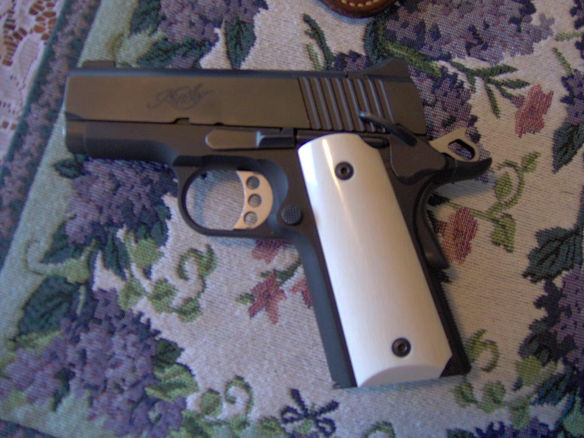 Let's see some of your favorite carry weapons and the associated rigs. I know most of us have several so let's keep it down to a dozen or so ( well maybe 2). I will post mine when we get back from town (52 miles round trip!!). Hope this post is full when I get back!! Take care and God bless. cordell Ooooop's just informed we have 20 minutes, and I do have 3 bad pictures so I will post them now. My main CCW is a .45 acp Kimber Ultra Carry II. I use this because I trust it and I am proficient with it. I use a standard pancake holster because I can hide it best and use it for several types of weapons........Yes those are Ivories .....TC&GB....cordell
