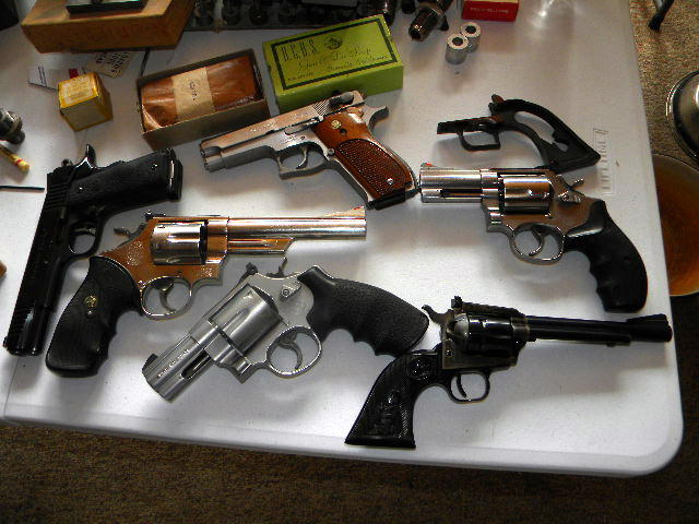Them gun shows are kinda expensive. The picture I am going to try to load is some of the handguns I have bought lately..One or two have to go of course..Most of these were gun show or auction acquisitions. I hope you find somethig you like at the show..Prices are a bit high at shows but able to be talked down a bit..on Sat evening or Sunday. Hope the picture isn't too dark.. In the picture is a 6 inch M-57 41 mag as well as the 3 inch 657 41..the Colt New Frontier 22 has the extra cylinder..A S&W 639 9mm(gotta go)...the 696 L frame 44 special with 3 inch bbl. and a Charles Daly 1911 45 auto that really does shoot pretty well. I have been carrying it on ocassion the 3 inch 41 Mag is gonna go too. and I may sell the Colt as I have a Ruger already.. Some of these I took as partial trades There is a RCBS cardboard die box in the upper part of the picture. The dies are still wrapped and taped from the factory. They have to date from no later than 1963. Just kinda neat..and they cost the grand total of 10 bucks..actually less cause I also got a set of 45-70s new in the box..It is truly amazing what you can come up with at a gun show..I even got another Dunbar press for 30 bucks. no shellholders..but I bought 3 RCBS univeral adapters for 5 bucks each.. Oh and the Ruger SBH grip frame is a steel frame I bought from a guy for 5 bucks. A left hander used it as that is where all the blue wear is. Gonna rust blue it and put it on mommas old Model SBH. Not pictured as it was a shotgun 2 days after the show a lady brought me a Winchester M-12 16 ga field gun..Didn't really want it but bought it cause she needed the money. I'll get my money out of it..but have no use for a 16. She also has a Winchester 1886 rifle in 33 Winchester she wants to sell. It was her fathers. Love to have it..but will probably just sell it for her..