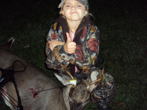 Well 4th time out seems to be the charm here. My 8 yr old boy killed his buck on his 4th time out this year and last night my 6 yr old daughter connected on her first buck ever after 4 days of hunting. I just got back from and Idaho trip where I killed a bull elk, so the woods was left alone for about 2 weeks. After checking the trail camera on the way in, I knew we'd be seeing some action that night. We sat for about an hour and I told her to get ready because in 10 minutes the bucks would be cruising. Not 5 minutes later I hear a dear coming. The buck was about 40 yards when we spotted him, so I fired up the video camera and hit my grunt tube a few times. He came in on a string and she closed the deal on this nice little 6 point with a 23 yard shot. The buck ran 30 yards and fell over. Her reaction on video was priceless. I'll edit the video and get it posted here. She sure made dad proud and now we have another hunter in the family. Now that both youngsters are tagged out, dad can start hunting during the final and best week of bow season. Needless to say it's been a good week...a bull elk and a first whitetail taken by my 6 yr old daughter! I'll post about my Idaho adventure soon.