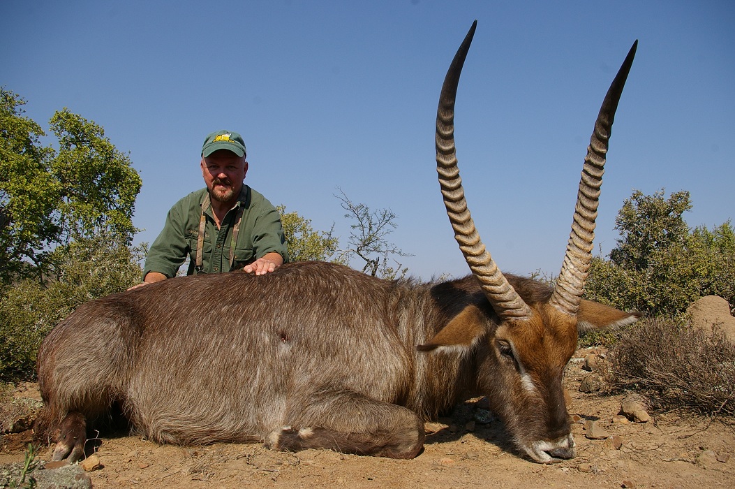 Follow up to this years hunt in the Eastern Cape, which remains one of my favorite places to enjoy great hunting and at an affordable price. Took 3 clients with me; two hunting, one Observer (artist). We had an exceptional 10 day hunt with the two guys taking 20 trophies between them. I hunted very hard for a specific Waterbuck (found him the last day but he eluded us..barely) and a Blue Wildebeest that we never found. He'd been seen occasionally but disappeared during my hunt. Below are some pics of the trophies I was fortunate to take: very large male Baboon, 30" (spread) Blue Wildebeest, Red Hartebeest, Warthog & 30" Waterbuck. With the exception of the Baboon (which I used the .223 pushing 60 grain Nosler Partitions) I took the remainder of my trophies with the .280 using 160 gr Nosler Accubonds or 165 gr Remington Core Lokts. My clients took Kudu, Black & Blue Wildebeest, Blesbok, Springbok, Impala, Warthog, Duiker, Zebra, Gemsbok, Mt Reedbuck, Red Hartebeest, & Caracal Lynx. I did some varmint hunting and had a great run on Porcupine's and Spring Hare's. On the last day, I stayed in the bush, trying to find those two elusive bulls I had hunted all week while the guys went to Addo Elephant park. They all reeled at the size of an African Elephant...which managed to come within 5 feet of the cruiser. All in all we enjoyed another great hunt with some fine friends.