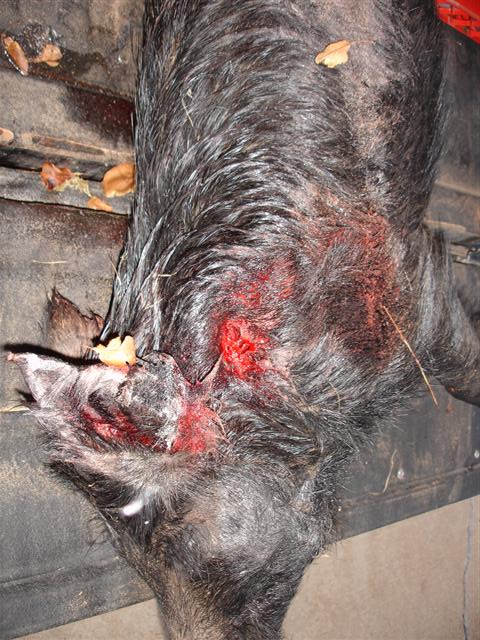 SW Oklahoma is over run with wild hogs. i hunt them at least one day per week every month of the year, usually with a .50 muzzleloader. Here are two that were killed recently. The sow went about 140 pounds on the hoof. The spotted boar went about 175 pounds. The sow was running full tilt at about 90 yards when hit . She was DRT. The boar was standing broadside at about 120 yards. He was hit behind the shoulder. At the shot the boar took off, ran about 75 yards and hit the dirt. The bullet shredded the heart, lungs and diaphram. The exit hole was about 3/4".