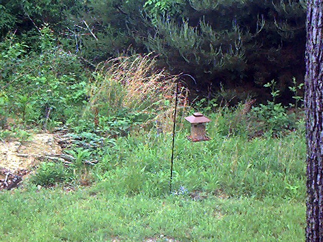 When I got back to the house and let her back inside, I took a peek at the other dogs and took a walk round the property. Still had my camera w/ me, and lo and behold...there on 1 of the birdfeeders by the cutover..I dun snuck up on some dove. You caint see em all that well..but they are right at the bottom of the pole. 3 altogether. Then I wished I had took Wild Woman w/ me..lol
