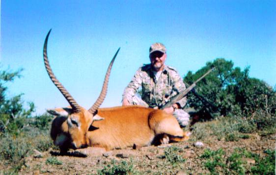 Continued...7-17-06 Around noon we spotted a good Red Lechwe standing on a ridge within some bush. We began our stalk but something spooked him and we never saw him again. We bumped some Eland and they ran off like a herd of Buffalo alarming everything in the area. We walked some distance before Meyrick noticed a good bedded ram above us on a hillside. Problem was; he was watching us as well. We had to continue walking past him until he was completely out of sight. Then we were able to turn into the wind and try to back track out of sight. We covered a lot of ground before my PH could make him out with his Swarovski's. Now the ram stands up, and starts lifting his nose. Fortunately, he wasn't looking our way. We crept forward a little further and closed the distance to 213 yards. Meyrick set up the shooting sticks and I found him in my cross hairs. He was very nervous and about to skeedaddle when I took him in the left shoulder with the 160gr Accubond. He leapt into the air and hit the ground stumbling. He only went 10 yards at most. Complete pass through for the Accubond. I was really becoming more and more impressed with this Nosler bullet. As I approached my ram I began to understand why they are called "Red" Lechwe. The high mid day Sun was shining down on this beautiful animal and his golden shimmering hair had a coppery red tint to it. I was once again awed by one of Africa's beauties. Nice heavy bases and long forward curving horns makes him a favorite of mine. This hunting trip has already surpassed my wildest dreams. I should have been here years ago, but like most of us living in the US, the mere words "African hunting" jerks a knot in our neck and we think "There's no way I could afford a trip to Africa." Check again my wishing friends. You can hunt Africa for less than a good trophy Antelope/Mule Deer combo. Don't get me wrong: I love to hunt here at home and I've been from Canada to many western States, but price a Moose hunt in the Yukon or dare to price a Stone sheep hunt in BC or Alaska and Africa suddenly becomes the bargain of the century. I'll get off my soapbox, I'm just still excited as hell Continued.....