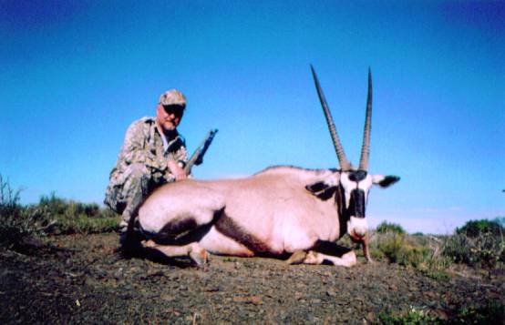 Day 6; July 18th. We headed for Dikkop Flats this morning to hunt Gemsbok. The day before Louis had taken a fine 38" cow but I would be looking for a bull. We walked a long way across the plains until we found a bend in the creek Denham had told Meyrick about. This area was a bottle neck for game and the Gemsbok would most likely appear in the area sometime during the day. We saw Black Wildebeast, Blesbok and Springbok during the morning and had one Blesbok walk within 50 yards. Later a herd of Springbok came within 20 yards without noticing us. The wind was in our favor. About 10 am we saw the Gemsbok coming around a ridge to our front. We were going to have to close the distance rapidly if I were to have any chance at a shot, so when they went into a deep depression, we were up and fast walking towards them. We were almost to our predetermined spot when they suddenly appeared coming over the ridge. I immediately sat down and readied my Bipod. They were in single file and Meyrick said: "Fourth one from the back." I quickly single out the bull and let him walk into the cross hairs. At the shot he reared up and ran forward, disappearing into a deep dry creek bed. I readied another round but he never came out. We slowly went into the high brush and found him expired. My shot had passed through the inside of the right shoulder and broke the left shoulder. Top performance from the 160 gr Accubond. Range was 203 yards. Time was 10:30 am. Nice, heavy symmetrical horns measuring 35 inches. A fine bull Gemsbok. After taking some pictures, we loaded up and took my bull for skinning. This was accomplished in short order by Jackson, Meyrick and another skinner. They were finished in less than 30 minutes. We packed up and headed off to hunt Black Wildebeast and Blesbok....continued
