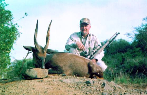 Day 3: July 15th. The evening before, we had spotted a nice Steenbok just at dusk. Meyrick advised me that he would most likely be with a female, and remain in the immediate area. On the morning of the 15th we returned to the area and I had just noticed the old stone fence where I had seen him the evening before when a female Steenbok jumped up out of the grass. Right after her was the same male I had seen previously. I exited the truck, pulled my .223 out of the case and bolted a round into the chamber. The Steenbok bounded uphill and stopped and a rock ledge, observing us down below. I adjusted my Bipod and centered just behind his shoulder. Range was 141 yards. I fired and zipped right over his back...he stood there. Lowering my crosshairs to the bottom of his chest, I squeezed the trigger and "Thump!" He crumpled. Again, the 60gr Nosler Partition went through this very small Antelope and did mimimal damage to the skin. I'm having him mounted lifesize; standing on a rock ledge for a wall mount. To be continued.....
