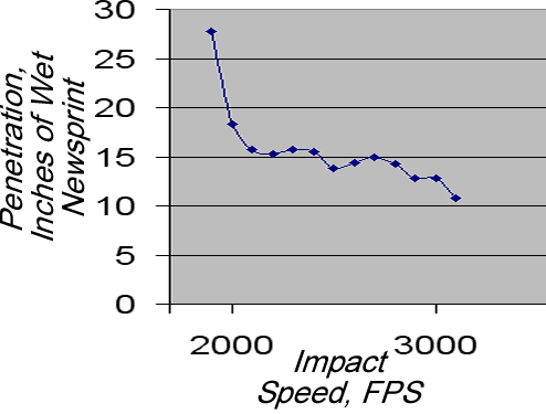 Most people think that if you graph penetration on the vertical axis vs. impact speed on the horizontal axis, the line slopes upward to the right, i.e., more speed = more penetration. This is completely wrong. I've attached a graph of what five standard cup and core type 30-06 180 grain bullets do. The slope is downward to the right, i.e., in reality more speed = LESS penetration. If a standard bullet is going too fast, it opens too much, too fast and penetration suffers seriously. Note how poor penetration is above 2800 FPS. A 243 can get a 100 grainer going about 2950, so you could be well above the point where penetration dramatically drops with standard bullets. Ballistic tip bullets are built to open more violently than standard cup and cores. That's OK for whitetail, but I don't think you'll like the results with gnarly old hogs. It's hard to beat a Nosler Partition in this application. It's penetration curve is just plain flat at 17" from about 1700 FPS to as fast as you can get the bullet going. Another one to look at is one of the Barnes all copper offerings, or perhaps even the AccuBond or old fashioned Nosler Flat Base (1700-3100 FPS) I'll admit to not being a hog hunter, so someone here with more experience in that area may offer a different opinion. But based on what I know about bullets, that's my opinion. In any event, good luck and good hunting. |