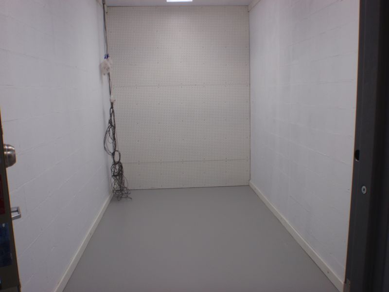This is the reloading room, about 20x20 with the window looking down the range which is 200 meters with a 15ft high berm at the end. The window now has a solid steel 1 inch square welded bar system. Note the epoxy covering on the floor throughout the building. The cabinets are setting on the floor still in their boxes. The L shaped counter top will be as the one described for the metal shop.