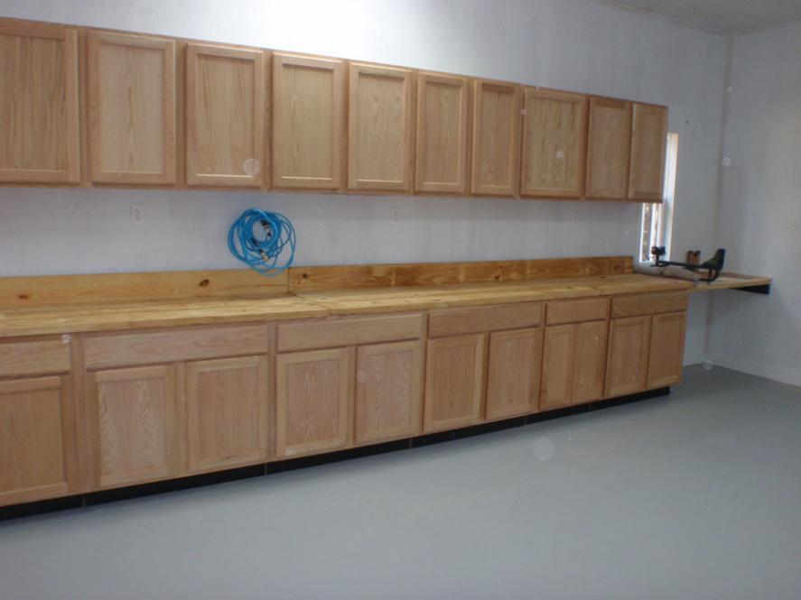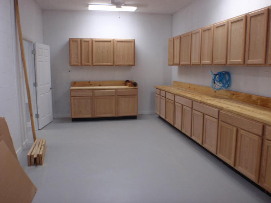 This is the wood shop area L. With the reloading room 32 feet cabinets set including the 2x8 glued together tops with back splash on the R, the wife and I set the cabinets and finished them.