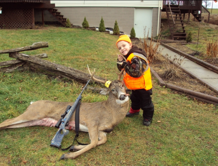 As some were following in the reloading room I started a few month's back building a custom fit .223 for my small boy to go hunting with dad. After the gun was built, and non-stop practicing, it came down to what bullet to use. I chose the 53 gr Barnes TSX. After some handloading I had this round shooting 3/8" groups. My son was religously shooting 1 1/2" groups at 100 yards. He put about about a hundred rounds through this gun and he was definately ready in my eyes. We practiced for about 2 months out of a 2 man ladder stand I had set up about 5' off the side of my deck. I wanted him to practice in the enviroment he'd be hunting out of. I believe this made all the difference in the world when it came time to make the shot. Teaching him where and when to shoot deer was simple, since he's my TV buddy when it comes to watching the Outdoor Channel. At given times I'd just ask him where he would shoot that deer on TV and he would always point in the right spot. In 06 PA started a Mentored Youth Hunting Program wherby if the Mentor (me) deems his/her child worthy, then they can go hunting prior to taking the hunter saftey course. The legal age to hunt is 12 in PA prior to this and you had to successfully pass hunter education. Once he turns 12, he'll have to take the course. The rules are simple. He had to be within arms length at all times, only allowed to handle the gun while shooting and obviously follow all the other rules set by the PAGC. For $2.70 he gets a buck tag, a turkey tag and can shoot all the coyotes, groundhogs and squirrels he's allowed. Last week I set our two man stand in one of my honey holes and I had a big buck picked out for him, but really any old buck would have done in either of our eyes. I then wrapped the stand in burlap to hide any movement a 6 yr old may make. The day was all about him and the site was ready. On to the Hunt: I woke him up early and we ate breakfest. He was so excited, so I packed the backpack with all the goodies we bought the day before and got into our hunting clothes.After Grandpa arrived we got in the truck and drove the short distance to my hunting spot. The stand was about 4-500 yard walk. Of course it was raining so got to the stand as quickly as possible. He easily made the 17' climb up the stand and we were ready to hunt. I setup a tree umbrella, what a life saver, since it rained most of the morning. As it started to get lighter out, I told him to listen for gun shots and when that started, begin to look for deer. We heard 12 shots before the first set of does came by...shucks. Not 5 mins later I see another doe coming and this buck right on her tail. They stopped about 100 yards out and he began to run her a little then start to browse. I took this time to rid us of the full cup of hot-coco he was drinking and get him set up for the shot. At this point the only thing visible was his head, so I put the scope on 3x and pointed the gun right where the deer's head was and he got on the gun. I asked if he could see the buck, and he said "oh yeah". I then cranked it to 6 or 7X and the buck took a couple steps into the opening. That was all he needed. I told him to take his time, put the crosshairs right behind the shoulder and squeeze the trigger...2 Seconds later....BANG.... The buck turns right at us takes off like a rocket. I grabbed the gun and recylced the round. By that time he had ran about 50-60 yards and was only 40 yards out.....I did not know at this point if he had hit the deer or not, but I was about the find out. He just piled up all of a sudden and I'm sitting there in pure awe... I'm thinking.."did this just happen?" WOW...we both started War Hooping... My 6 year old just put the smackdown on a big ol buck at 100 yards. He had his buck down in the first hour of daylight, his first time ever hunting deer. Now this wasn't the "big" buck I had lined up for him, but I knew of this buck from archery season. All of his hard work, dedication and practice paid off. I had the buck back to the house before lunch and we got a quick bite to eat and he wanted to go back out! He sat all day from the daylight to daybreak. I could have shot a small 6-7 point, and we had several does come by, but I don't just shoot any old buck just to say I did. I have only a few that I would consider shooting with a rifle that I've been hunting since archery. Hopefully the gods will bless me as much as they did my son in the next couple weeks. Needless to say I'm one PROUD PAPPA. He's hooked, it's all he talks about now. I have a hunting partner for life now....I'm still in awe about that whole day. He still says that it was the "best day of his life, ever..." I'm sure he'll always remember this day, as will I. What more can I say??? Other than WOW. I guess on to Turkey season now! P.S. We just dropped his buck off at the local taxidermist and it's the biggest buck brought in so far. He can't wait to go into school tomorrow and tell all of his first grader friends.
