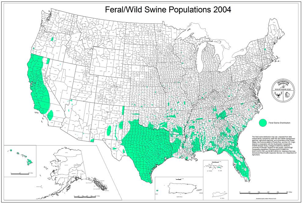 Also notice that after 88 they no longer even tried to keep track of areas with less than 10 per square mile. This was because the map basically would have covered the entire south by 2004 if they had. These maps also only track KNOWN swine herds. IE those that have been tagged by the National Feral Swine Mapping System.