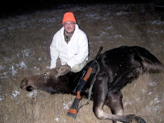 While it is a cow moose, it is still my first ever moose. One shot with the .308 my father-in-law used to use (pre-'68 rem pump) from 170yrds put her down. My hunting buddy also took the calf at the same time. Then the work began!