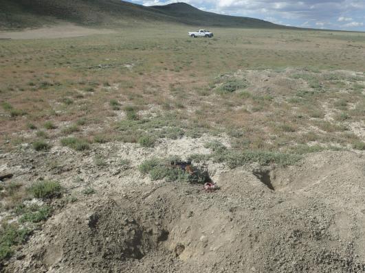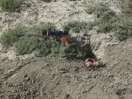 Well I stopped for about 15 minutes the other afternoon on the way home from work. Thought I would see if I could get a few Pdaws. My weapon of choice for this day would be the Contender, with a 14", 221 fireball barrel. The load constited of Winchester brass, ignited by a Remington 7½ primer, powder was Lilgun and a 34 grain HP from Mid South Shooters Supply. Now while my shots on this day were all less than 125 yards, I have taken them out to just shy of 300 yards with this combination. I shot 4 times from the supported hood of the truck and got 3 dawgs. My first shot went high. The next three all found their mark. The wind was crossing at ~10 mph.