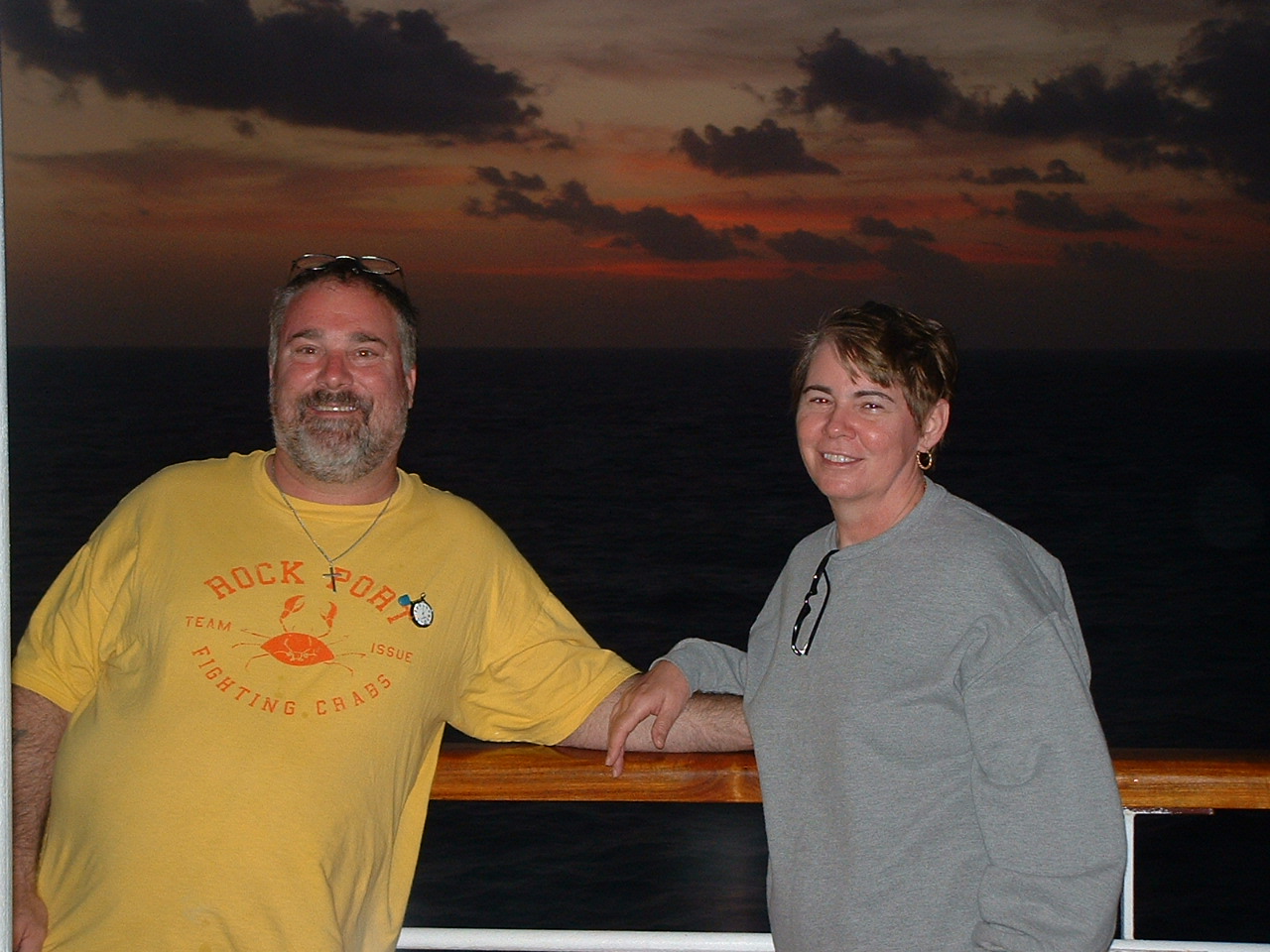Here's mine. This is my wife and me on a cruise to Cozumel, Mexico on the Lido Deck just as the sun set.