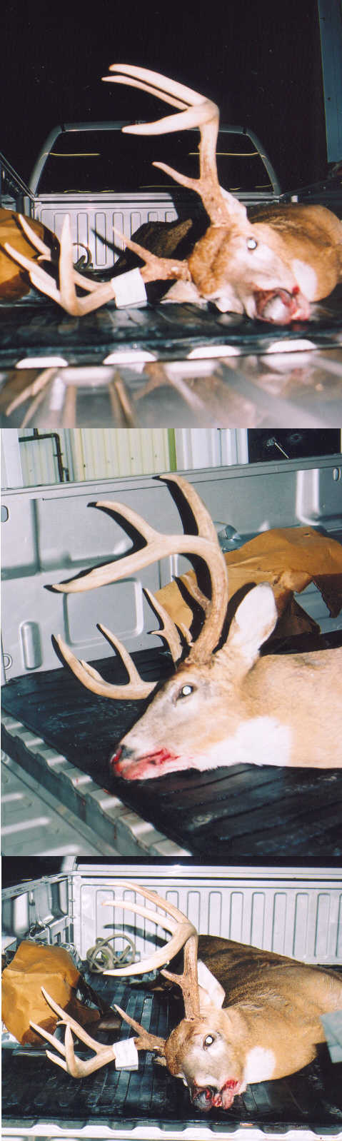 Omega, I'm talking gross score, he's much bigger than he looks in these pics! I was thinking after I got the pics developed & looked at them that I should have had the guy hold him up. If you look at the bottom pic you can see the rack sticks up above the bed of the truck. I guess you'd have to see him in person, I'll call the guy & ask him what he ended up scoring, he said he was going to put him right over his fire place next to his other buck.