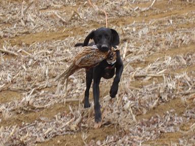 Here are two pictures I took last weekend. They are of my DK's or German bred shorthairs training for German testing. The first picture is my solid black DK finishing a 200 meter feather drag. The second picture is of my other DK after finishing a 250 meter fox drag. For more pictures or information on German testing or my dogs or the kennel check out my web site