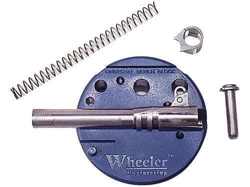 I purchased a wheeler engineering bench block the other day in anticipation of the need I will have IF my parts ever arrive from auto-ordnance. This simple blue polymer block is 4" diameter and about 1 1/4" thick. It has holes, cutouts, and areas already set to aid in working on 1911A1 pistols, and I look forward to using it for that. In the mean time I had quite a few other little projects to work on and found that the block works well if drifting the front sight on a rifle barrel. It works like a champ for most every project I have use it with so far, from taping in loose pins, to drifting sights. For $16.99 plus chipping and damaging I don't know how I did without it all these years.
