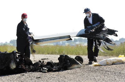 The scene shows evidence where the plane may have skimmed across a field before it flipped over, struck an embankment and tore apart on a gravel road. Fuel spilling from the wing tank, which ripped off on impact, fed the fire which had erupted.