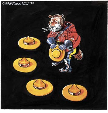 Hundreds of Mounties in their world-famous red serge tunics filled row upon row in the pavilion. Four Mounties placed black pillows with the slain officers' Stetsons on top of a traditional RCMP horse blanket just before the service started.