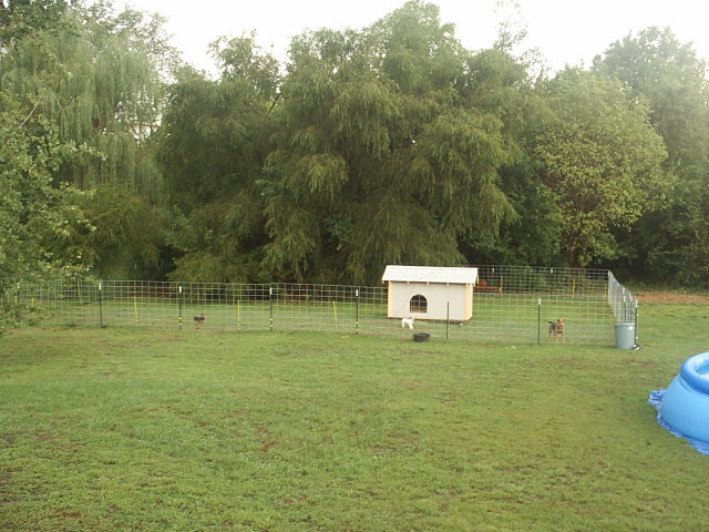 They live in the house, but sometimes we just cant take them and its nice for them to have a place to stretch and get fresh air while we are working. I built this pen around the big willow you see in the background that shades part or all of it all day long. The pen is 68'x48'x52". It has electric wire around the inside to keep them from digging or climbing. The house is 4'x8'x48" tall. Its carpeted and I put basement vents on it to allow circulation in the warm times and close them up in the winter. I also have a door designed for winter on the coldest days. I thought this was a pretty neat place for them.