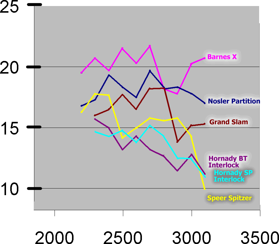 PS. I can't comment on the graph but using a 130 X out of a 7/08 I once shot the LENGTH of a big MN buck. The bullet hit at the neck/body junction and transversed the entire body (he was looking head-on) and lodged under the hide of the right ham.