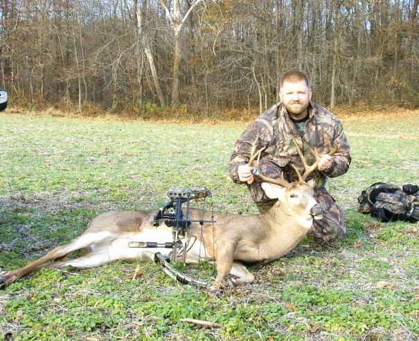 About 6:30am, I looked over to one of the doe trails that I had walked my scent drag on and saw what looked to be antlers low to the ground. As the deer got closer, I could see him walking along the trail with purpose. He had a nice rack from my position-at least a solid 8. I connected my release as he neared to 35 yards from my stand. He kept a steady trot. As he hit the open shooting lane, I drew and grunted. He never blinked-just kept his nose on the trail. I really didn’t want to take a moving shot in the early morning darkness with still so many shadows. I whistled. Nothing. He kept up his trot with business on his mind and before he finished his next two steps out of my lane and into thick brush, I sent a Carbon Express 250 Terminator tipped with a three bladed NAP 85gr. Thunderhead Pro broadside. He jumped as the arrow hit him and he ran up to the top of the ridge and appeared from my stand in the cut farm field to be chasing his tail in circles like a dog. I never saw him run either left or right so he either bounded off straight away or he bedded down at the field and timberline.