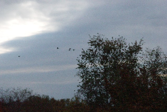 While watching those 4 deer, one of which was a spiked buck, I was treated to a couple hundred geese flying by. Focusing on them and taking good pics is tough when they are in flight. I was hoping they would come straight at me, but they didn't.