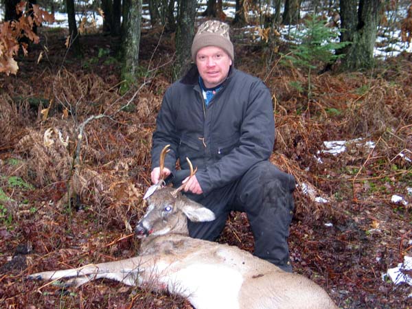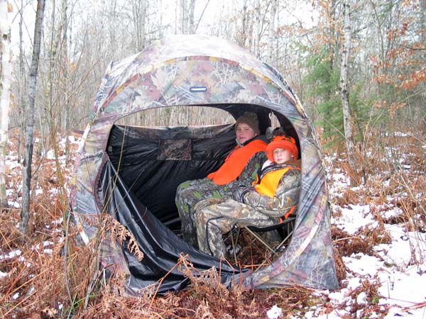 )On Weds, opening day, my father took a decent 2 1/2 yr old 6 pt. I had a small buck and doe walk by me opening morning, but the tag I have left says it has to have at least 4 points on one antler... so he walked. On thursday my buddy took a nice little 5 pointer. We only saw a couple of does after that but it was still a great time. Both of our sons came along to hunt with a camera. Some how these two never saw a deer (they might have had just a little too much fun together in the pop-up blind) Looks like my son and I will get a chance to hunt some private land this weekend, which under our new laws will allow him to take a deer with a gun, so I have my fingers crossed. I will get a few pics up here in a minute. How is every one else doing so far? |