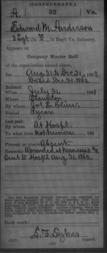 Edward was either stupid, brave or just had major bad luck lol....he was wounded at Manassas, Gettysburg & Fredericksburg and was captured in Nov 1864 at Ninevah. He was sent to Point Lookout Prison in Maryland. He survived and was paroled in May 1865 after the war was over.